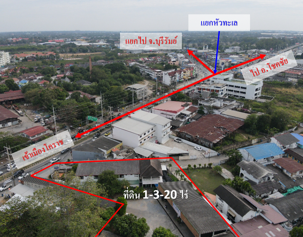 - ที่ดินติดถนนใหญ่ เข้าออกได้หลายทาง ติดถนนราชสีมา-โชคชัย ทางไปจังหวัด บุรีรัมย์ และเข้าเมืองโคราช